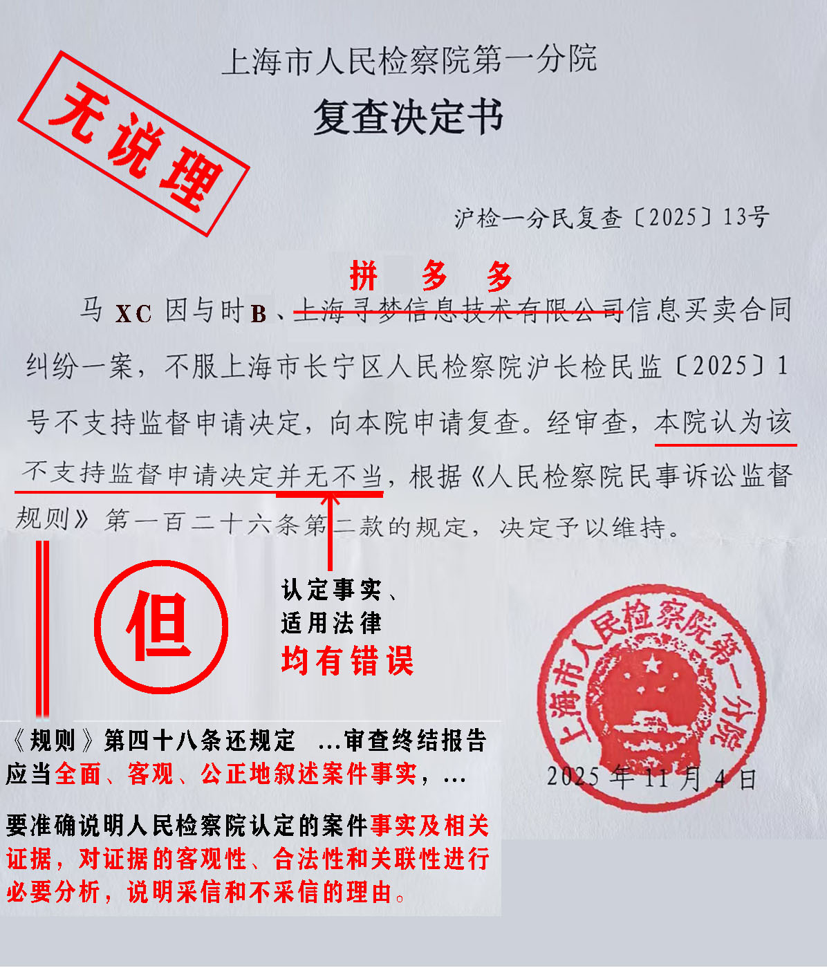 一、基本事实: (一)《上海市人民检察院第一分院复查决定书》沪检一分民复查〔2025〕13号,正文仅有133字(含标点符号),核心词只有一句话“经审查,本院认为该不支持监督申请决定并无不当”。 无释法说理。 (二)《不支持监督申请决定书》存在根本错误: “因时 x 售假行为构成欺诈,应当按照案涉商品的实际价值1199元共3单,依法向申请人承担假一赔三的法定赔偿责任,即向申请人赔偿10791元。”||| 该陈述 l 错误认定和叙述案件核心事实。《民事监督(抗诉)复查申请书》第19-20页,4. 案涉商品的实际价值1199元——认定错误。 l 同时适用法律错误。《复查申请书》第16-17页,2. 第二个事实——“时x售假行为构成欺诈”之陈述暗藏玄机。 二、申请理由: 依据: 《人民检察院民事诉讼监督规则》第四十八条 承办检察官审查终结后,应当制作审查终结报告。审查终结报告应当全面、客观、公正地叙述案件事实,依据法律提出处理建议或者意见。 《最高人民检察院关于加强检察法律文书说理工作的意见》; 《最高人民检察院关于实行检察官以案释法制度的规定》。 《规定》第五条 检察官办案释法,是指检察官在办理案件过程中或者办结案件后,通过检察法律文书或者书面、口头说明等方式向诉讼参与人、利益相关人等与案件有关的人员和单位进行释法说理。第六条 检察官着重围绕以下案件的办理开展释法说理:(一)当事人等诉讼参与人对检察环节司法办案的公正性存在质疑,可能引发涉检网络舆情的案件;(六)作出……不抗诉、不支持监督请求等终局性处理的案件;第十条 检察官应当围绕检察法律文书内容及检察机关办案过程中涉及的重点问题,或者释法对象要求说明的重点问题进行释法说理,具体包括:(一)认定的案件事实;(二)适用的法律条文;(四)办案的程序和进度;(五)释法对象提出的其他相关问题。第十一条 检察官进行办案释法,可以根据需要采取口头、书面或者其他适当方式。||| 申请人要求书面方式。 三、申请释法说理的具体问题(第一部分): (一)《规定》第六条(一),第十条(四)办案的程序和进度 1. 案件审理是否超期拖延办案。列出案件受理时间及运行过程环节时间点并附相应证据,尤其是调卷时间事实及法律依据。 2. 案件办理人员及组织形成时间。 申请人掌握的时间见案件补充材料8 关于管辖异议“提示”部分。 (二)《规定》第十条(一)认定的案件事实;《意见》七、检察法律文书说理的基本要求(一)阐明事实。要准确说明人民检察院认定的案件事实及相关证据,对证据的客观性、合法性和关联性进行必要分析,说明采信和不采信的理由。 3. 《不支持监督申请决定书》“案涉商品的实际价值1199元”依据? (1)《复查申请书》第19-20页标题4. 案涉商品的实际价值1199元——认定错误。(申请人观点) (2)《检察复查补充材料1》(原审法官隐匿依法调查收集的证据《光盘》及后果),第14页,5. 原审歪曲事实:案涉商品的实际价值1199元——认定错误。 (3)《补充材料3》(长宁法院一审裁判的5个反言)2. 法官关于标的物商品实际价值是100万元的几次反言。 (4)《检查复查补充材料7》(+附件:案件错误告知书与再审提审申请书)第30页,5. 案涉商品的实际价值是100万元___法官的几次反言,《光盘》能决断并直接推翻《判决书》最终裁判。 (5)请检察官依据《意见》要求作出说理,反驳申请人观点,以理服人。 (5)请检察官依据《意见》要求作出说理,反驳申请人观点,以理服人。 4. 本案当事人拼多多到底有没有提供证据《光盘》?一审法官是否隐瞒? (1)《复查申请书》第4页,(2)再审见而不审——再审引用了:② 邓x法官隐匿本案核心证据《光盘》; (2)《复查申请书》第67页,(4)(监督)检察官不提供该光盘给申请人看:(长宁)检察官说已调取档案,含光盘,但不能给你看。||| 可调取谈话监控佐证。 (3)第67页,②一审判决后,申请人申请查看卷宗后得知,《2024.1.9被告2提交的说明》叙述:“原告申请调取的下单当天的视频已刻盘”。 (4)《补充材料1》:1. 原审法官隐匿依法调取的核心证据《光盘》的事实是否存在? (5)请复查检察官明示《光盘》情况! (5)请复查检察官明示《光盘》情况! (三)《规定》第十条(二)适用的法律条文;《意见》七、检察法律文书说理的基本要求(二)释明法理。要结合法律文书的具体内容和结论,对人民检察院所作决定依据的法律、司法解释条文的具体内容予以列明,解释法律适用的理由和依据。 5. 《不支持监督申请决定书》“因时 x 售假行为构成欺诈,应当按照案涉商品的实际价值1199元共3单,依法向申请人承担假一赔三的法定赔偿责任,即向申请人赔偿10791元。” (1)适用法律错误。 《复查申请书》第16-17页,2. 第二个事实——“时x售假行为构成欺诈”之陈述暗藏玄机。 (2)请检察官解释此判决法律依据。 哪个法律?第几条第几款? ① 申请人认为合同违约,决定书为何强调欺诈?申请人对“欺诈”赔偿没有诉请。 ② 判决根据什么用“实际价值”?而不是“价款”?这都是专用词汇。 ③ 1199元是实际价值还是价款?100w(万元)是什么? ④ 本案买卖合同标的物是什么东西?申请人要买的是什么东西?得到的是什么东西?价值分别几何? ⑤ “假一赔三”的法定赔偿责任是哪条法律?哪条法律有“假一赔三”这个法律名词? ⑥ 本案申请人认为“假一赔三”是什么标准?判