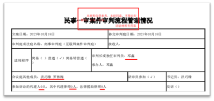 ① 造假合议庭:合议庭其他成员:洪巧缘罗林梅。||| 真实合议庭其他成员:罗林梅,人民陪审员杨翔(判决书尾部)。 ② 造假代理人:参加诉讼的代理人0人,其中代理律师0人,法律援助律师0人。真实参加诉讼的代理人3人。此处故意填写无代理人掩盖材料缺失。 卷宗《宣判公告》:本院定于2024年04月15日…公开宣判… 如此是为了掩盖《判决书》发送迟延。 造假环环相扣,费尽心机。 (6)邓鑫法官推脱错误判决责任:谎称本案已经过专业法官会议讨论。 《最高人民法院关于完善人民法院司法责任制的若干意见》……专业法官会议的讨论意见供合议庭复议时参考,采纳与否由合议庭决定,讨论记录应当入卷备查。 但卷宗并无任何讨论记录。 【处分参考】第七节 违反管理秩序和社会道德的行为 第九十三条 弄虚作假,误导、欺骗领导和公众,……