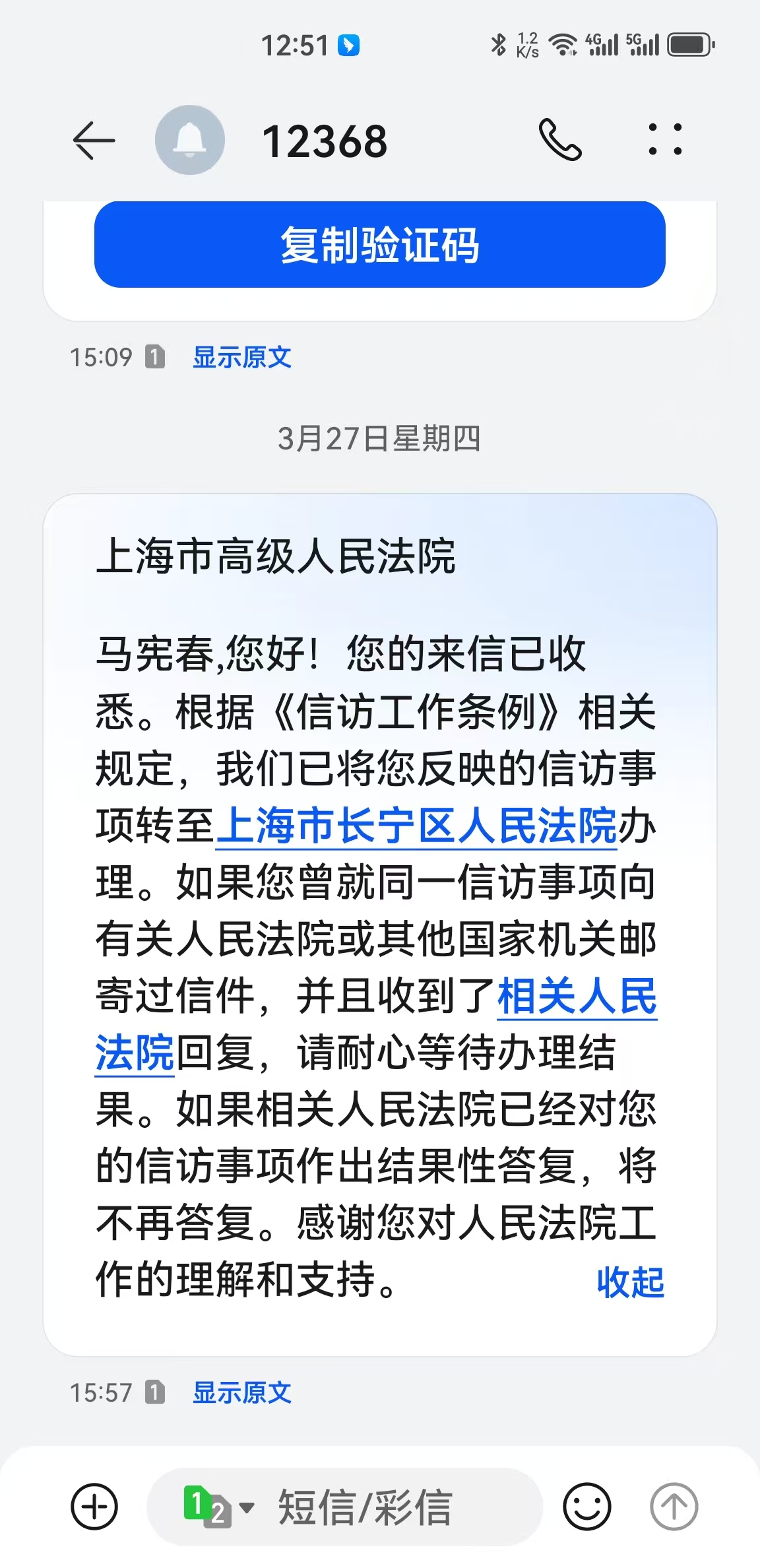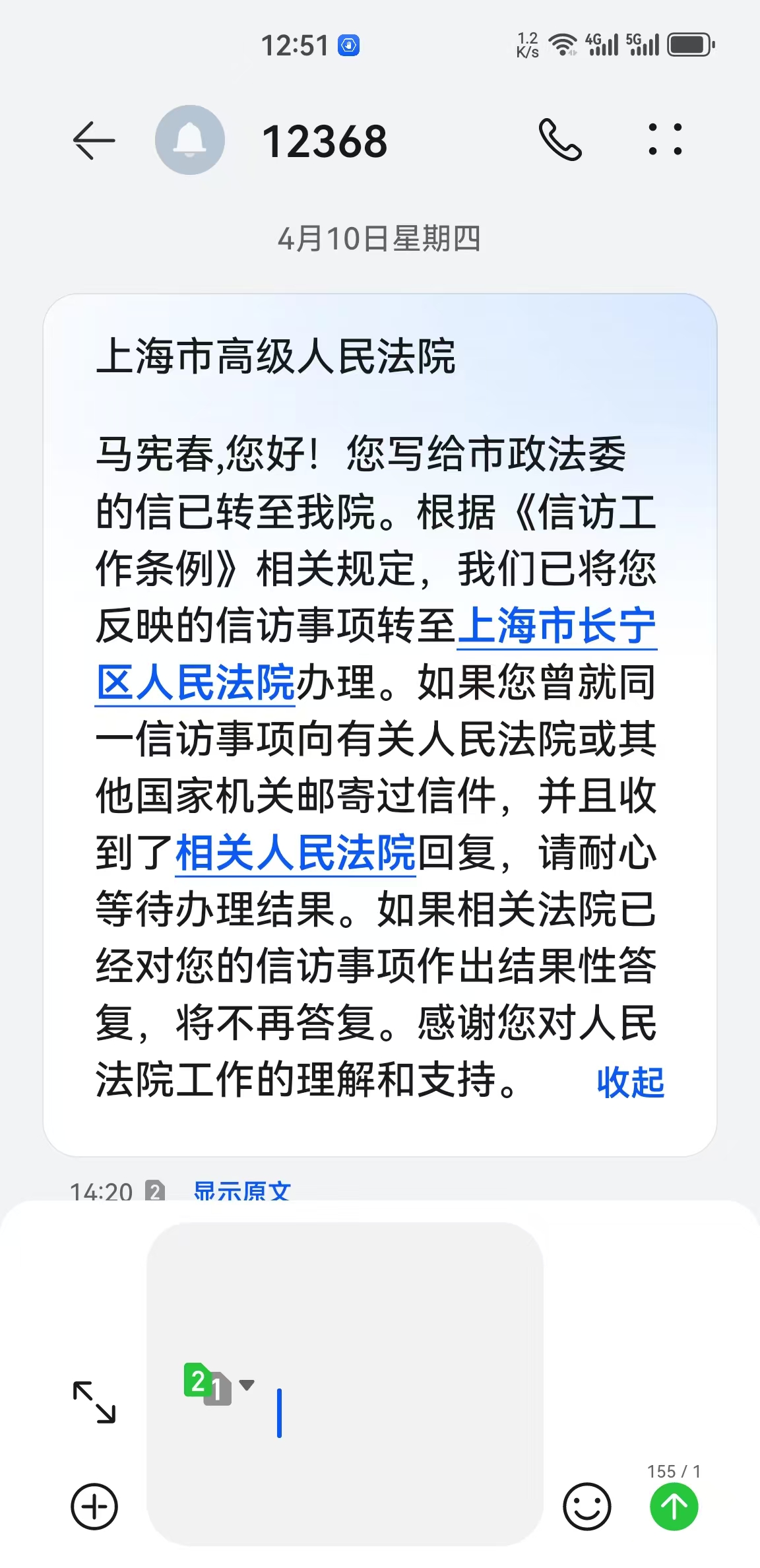 上海市高级人民法院收到举报信的回复
